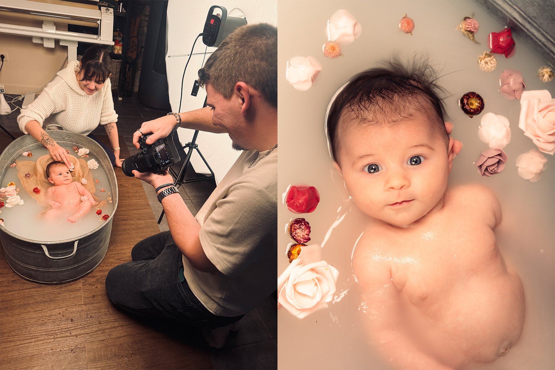Dans un univers doux, poétique et rempli de tendresse, nous allons immortaliser un moment unique : votre bébé dans son bain de lait, entouré de délicates touches florales.